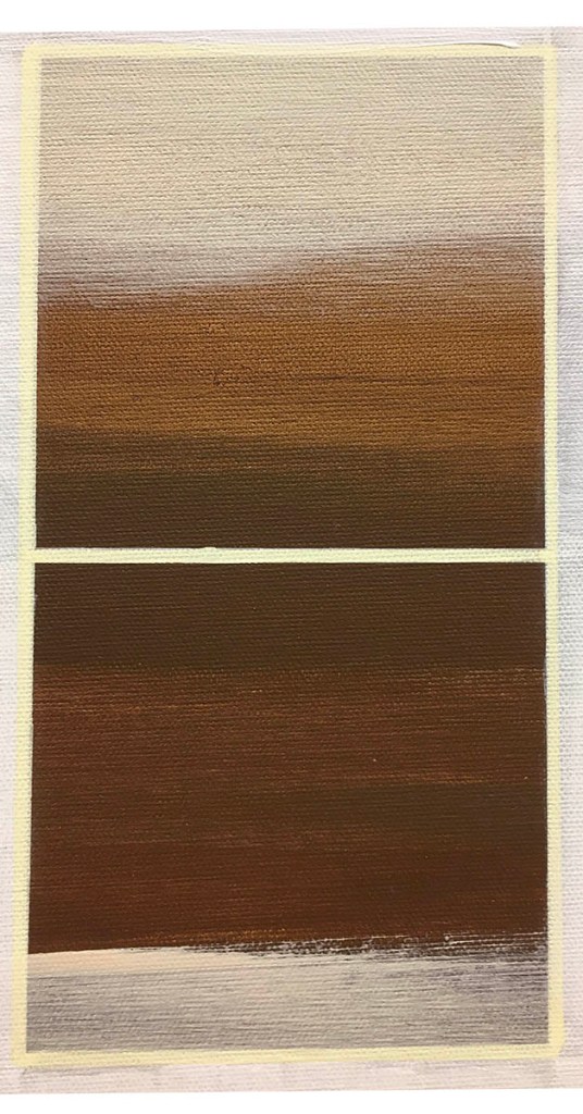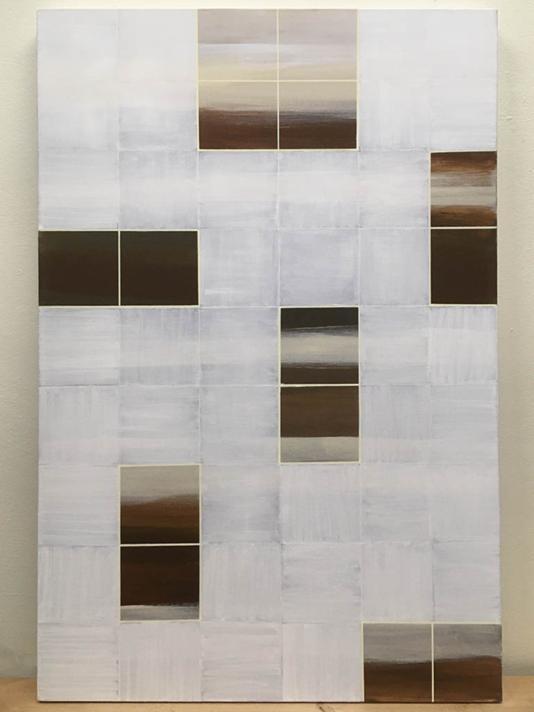 This painting was inspired by skin color tones. I overlaid the stripes of color with a grid, which suggest artificial social conventions. The next step was to cover certain sections of the canvas with many layers of transparent white paint.